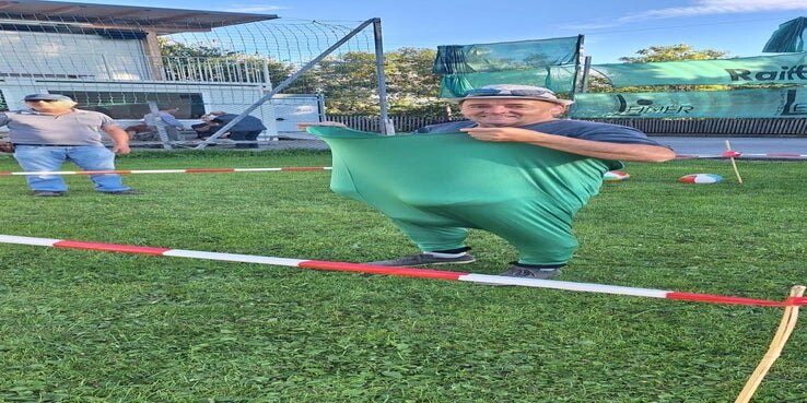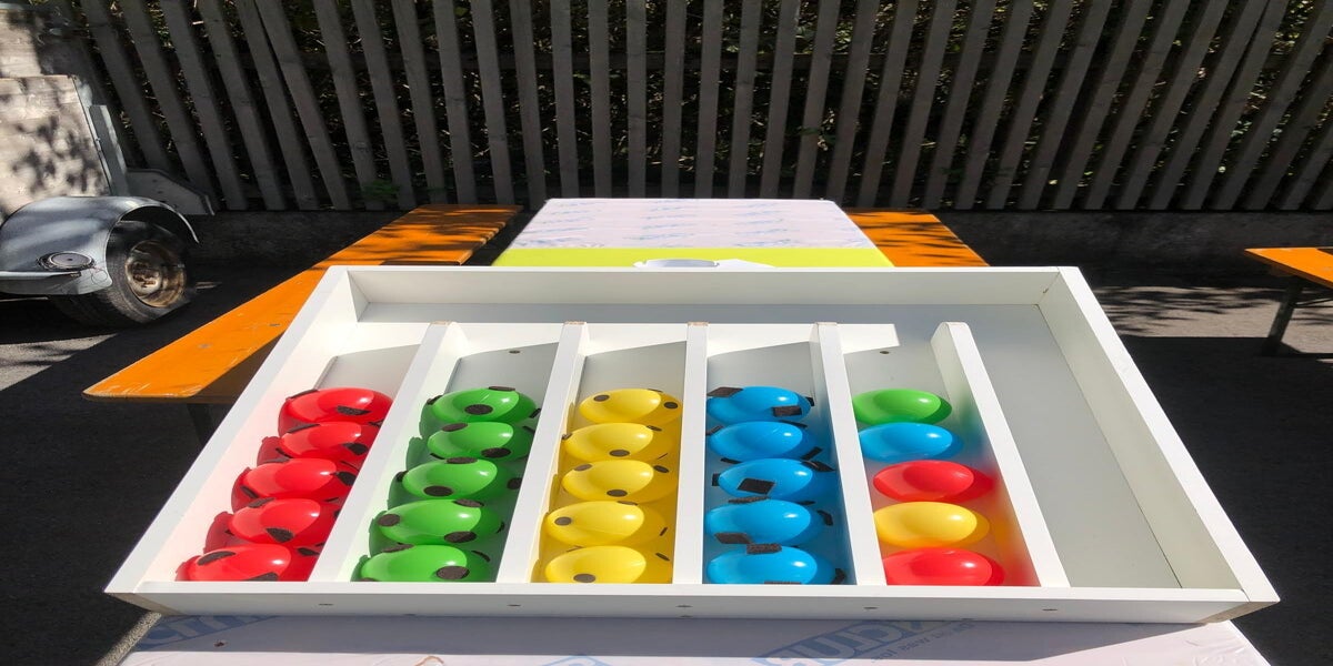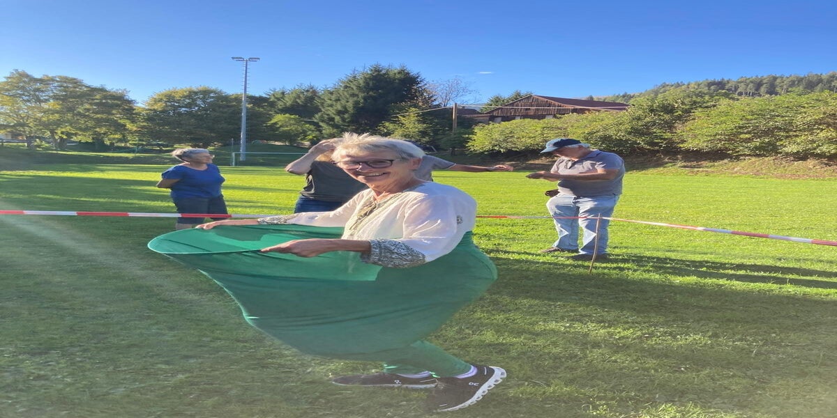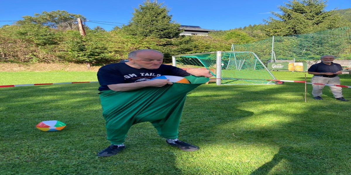 Danach essen wir die guten Grillspeisen. Es gibt ein Spiel mit drei verschiedenen Spielen: Lattl, Ballfangspiele mit einer sehr weiten Riesenhose und Farb-Ball-Rückspiel. Regina hat das Spiel extra für Blinde gemacht, dafür machen wir es auch mit Augenbinde. Die Bälle haben verschiedene Schaumgummi-Formen, damit man sie mit den Fingern tasten und fühlen kann. Dazu gibt es eine Stoppuhr. Das war nicht so einfach. Wir haben so viel gelacht, fast alle haben mitgemacht. Zum Schluss gab es ein Schätzspiel: Man sollte schätzen, wie schwer ein Korb mit Gemüse ist.